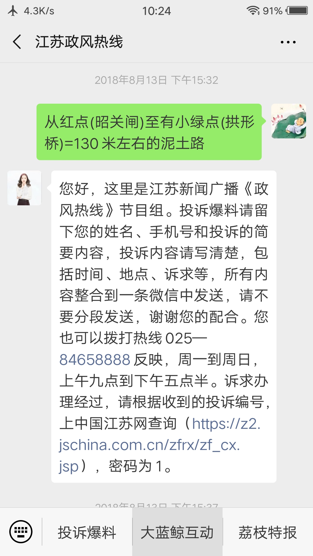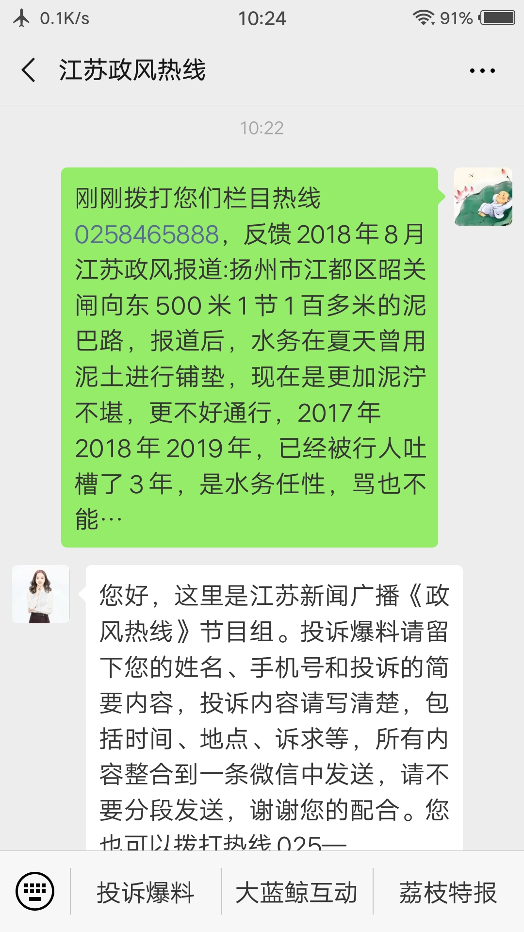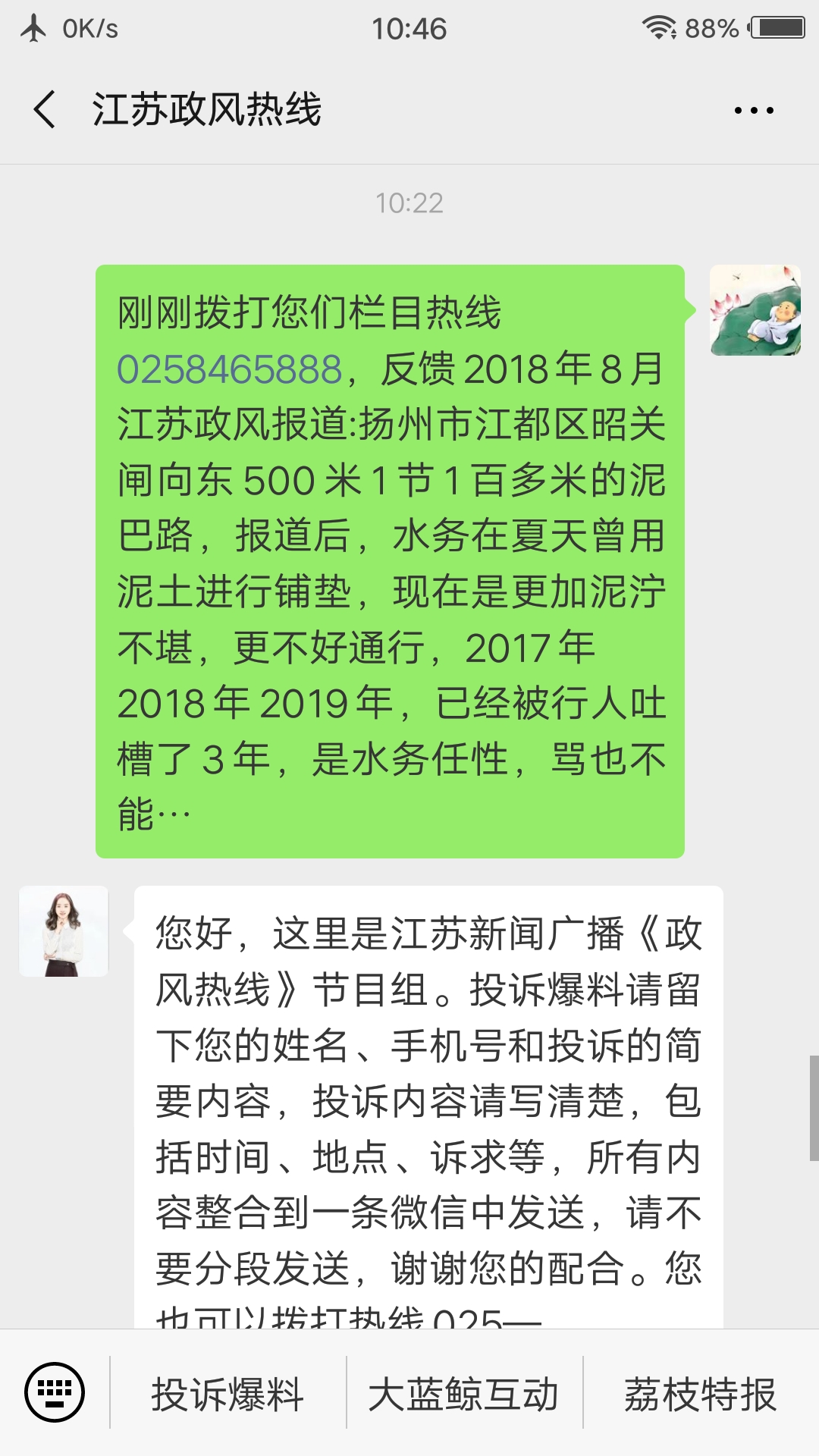 刚刚拨打您们栏目热线85889333,87650O00,江苏广播0258465888,反馈2018年8月江苏政风报道:扬州市江都区昭关闸向东500米1节1百多米的泥巴路,报道后,水务在夏天曾用泥土进行铺垫,现在是更加泥泞不堪,更不好通行,2017年2018年2019年,已经被行人吐槽了3年,是水务任性,骂也不能…