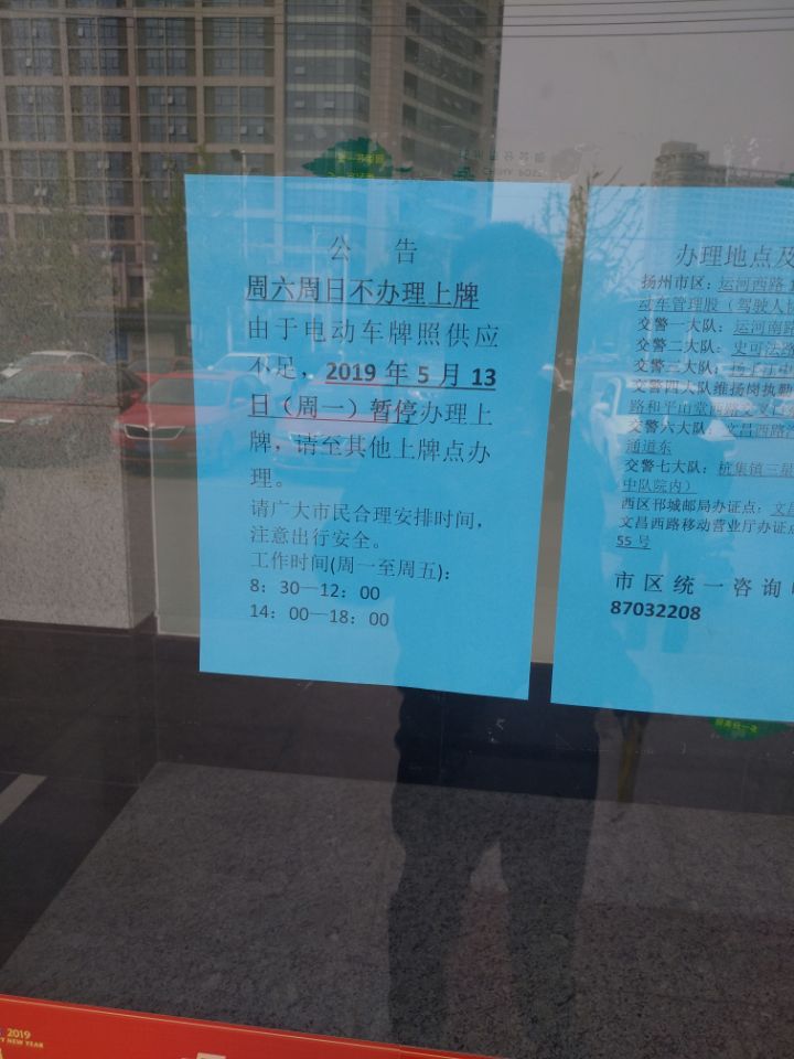 听到有关规定说扬州到2019年6月30号就停止办理临时的非机动车牌照,4月20号左右扬州新增设了代理办理点,本人去过好几趟都没有取得到号,有些人早上6:00就去排队因为每天限量,按照这样的速度势必有很多人是办理不到牌照的!