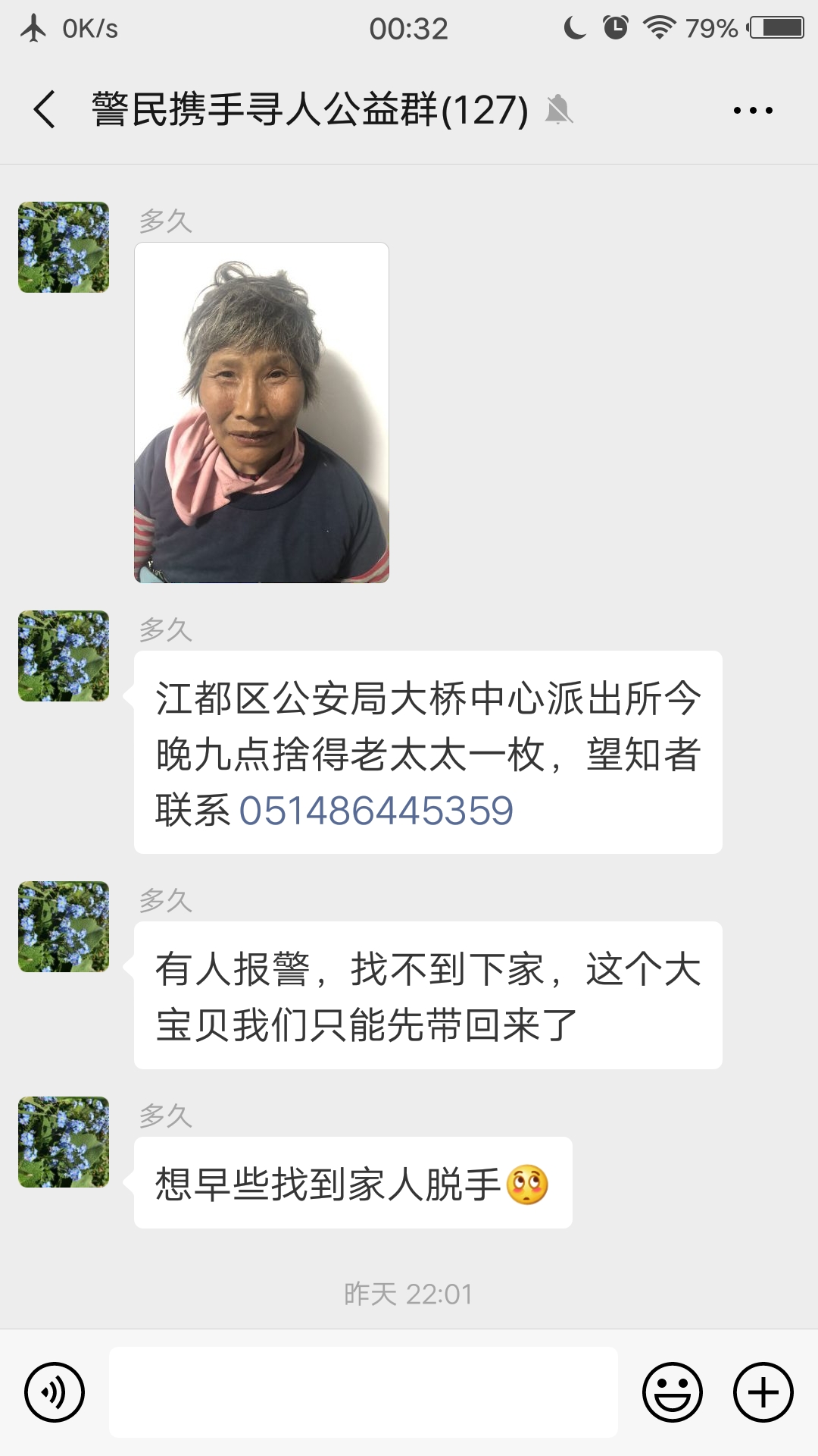 江都区公安局大桥中心派出所今晚九点捨得老太太一枚,望知者联系051486445359