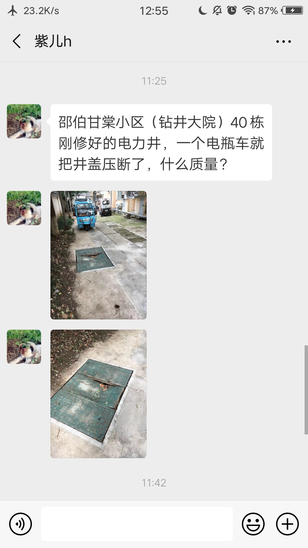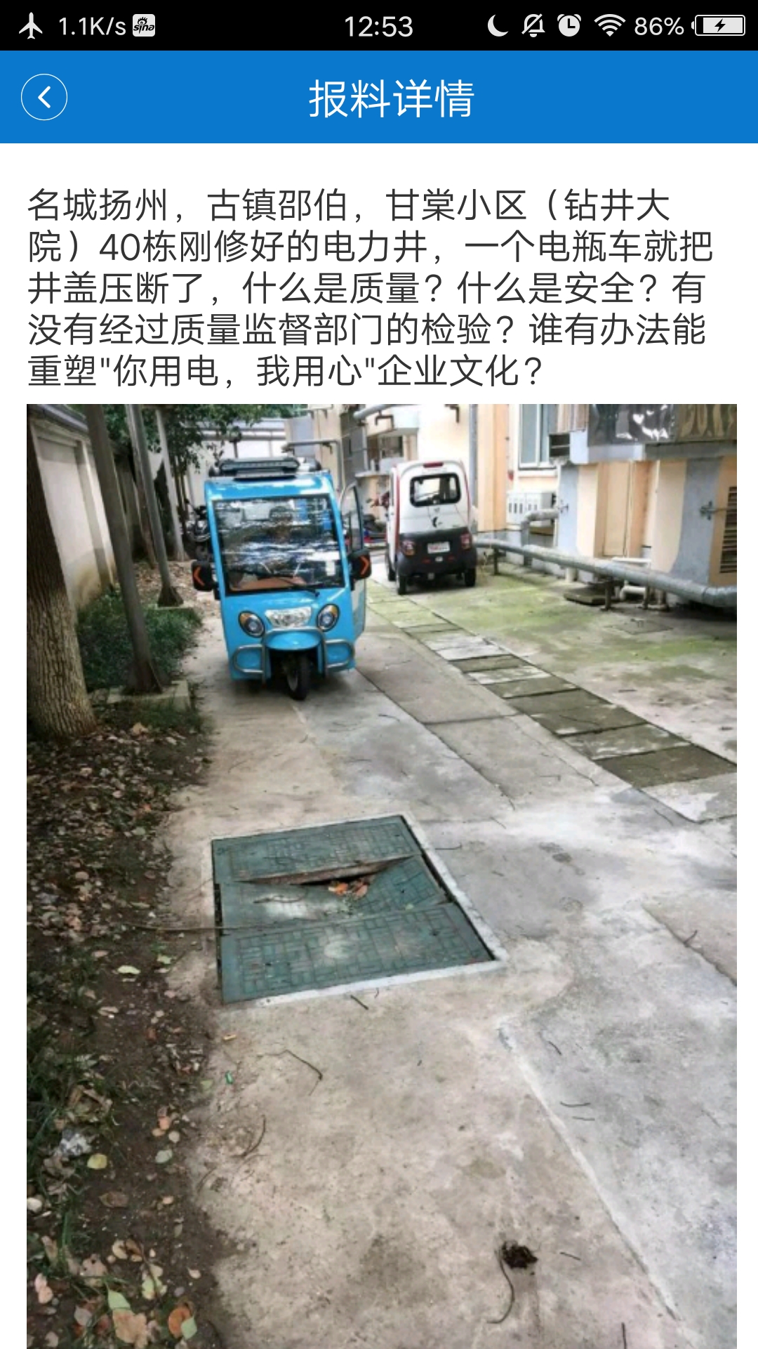 扬州邵伯甘棠小区(钻井大院)40栋刚修好的电力井,一个电瓶车就把井盖压断了,什么质量?(2018年油田供电:已经归扬州供电公司)