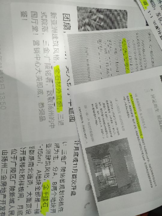1.在三金广陵铭著推广、销售期间,一致宣传外立面材料为全石材,工艺为干挂,等到施工阶段,却发现全石材干挂变成了一体板,工艺也改变。待业主发现现场询问,后所有公众号对于外墙宣传全部删除。对后期高空掉落的概率大大增加