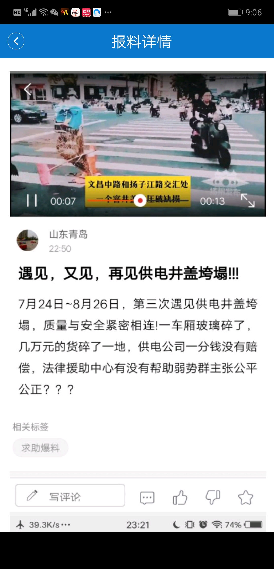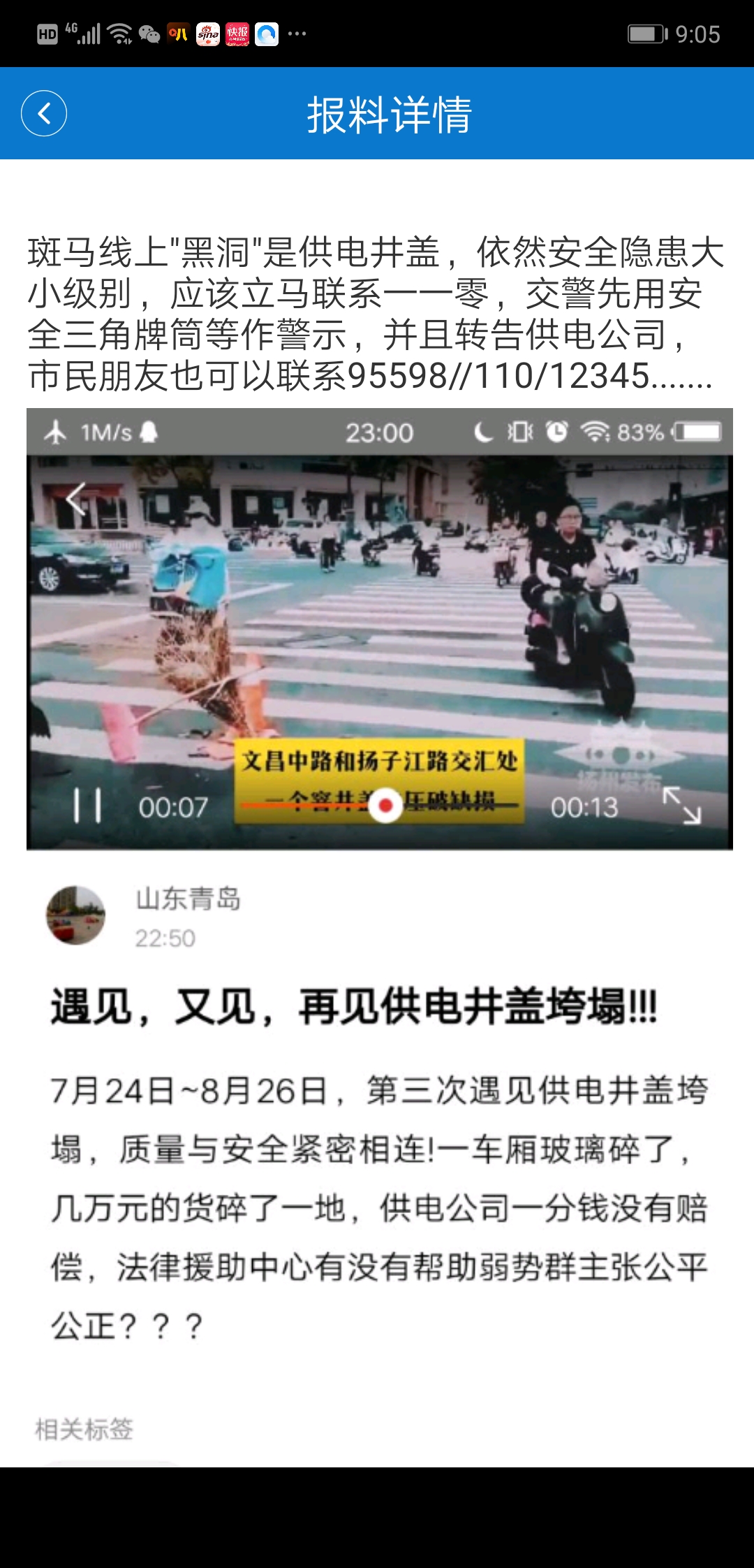 违章是产生危害的前提因素,江苏省优秀企业:江苏电力,特别给力,优待扬州,给文昌路市民中心提供电,电柜显示为24O伏(国标为220伏),给工业供电为435伏(国标为380伏),给扬州市城市道路使用定制三无井盖(低强度),造成伤害后,基本都是零赔偿!试问:还有哪个公司如此给力与欠力?