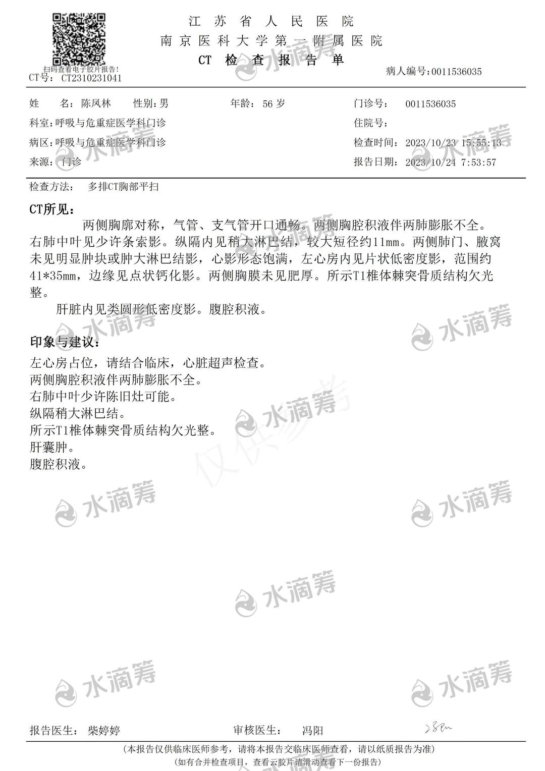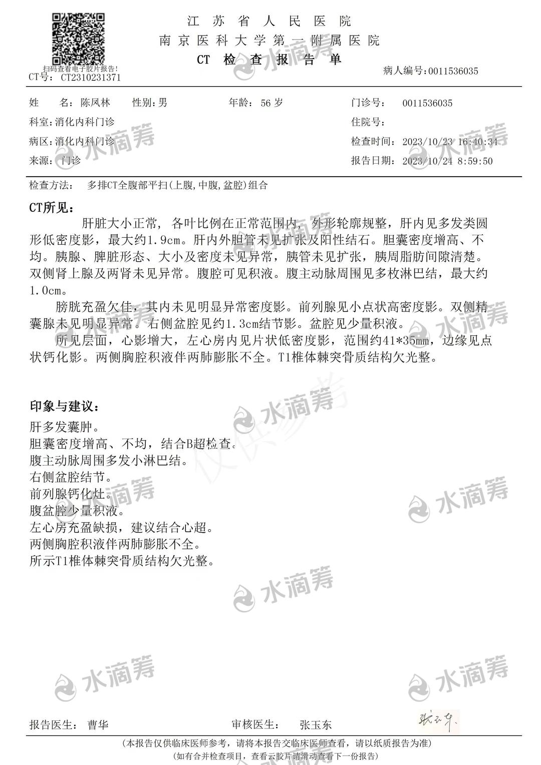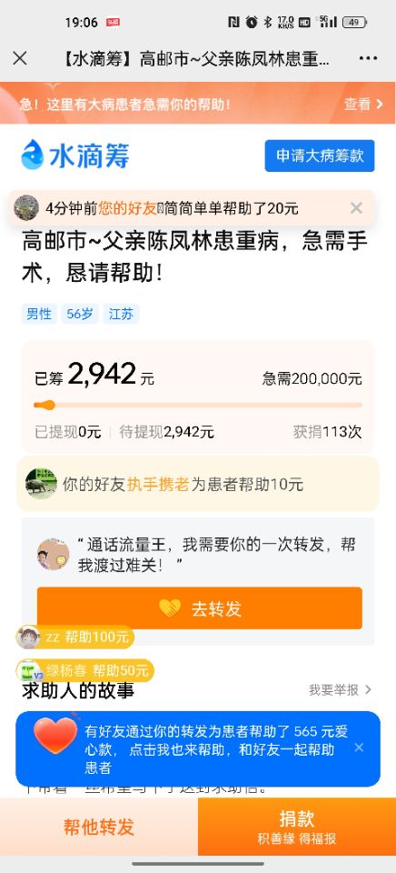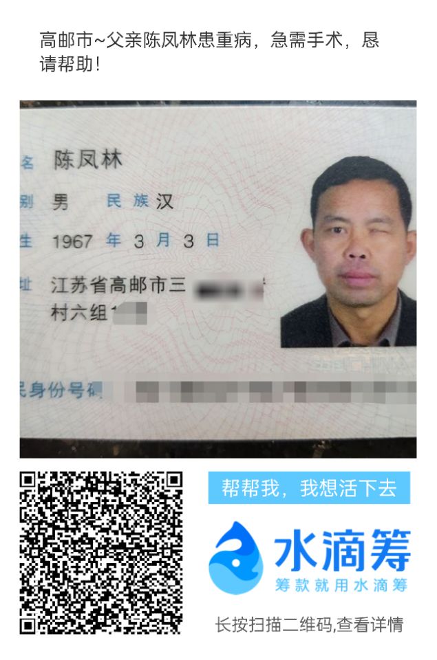 我叫陈璐璐,患者是我父亲叫陈凤林,我们家住【江苏省高邮市三垛镇保安村】,今年56岁,我们是普通的家庭,日子平平淡淡的也幸福!一场大病打破了我们平静的生活,之前父亲身体不舒服,出现胸闷,气短,喘气,到晚上睡不着觉,咳嗽这些情况,就去医院检查,检查经过检查,结果是【左心房占位,两侧胸腔积液伴两肺膨胀不全,腹腔积液,肝多发囊肿】这些病不是一般的疾病,是治疗周期漫长,而且非常费钱的病,以后的路还很长,却发现生离死别只在一幕之间,灾难来的如此突然,让人措手不及,难以接受。后期需要住院手术各方面的治疗,需要20万甚至更高,这结果让我们全家都陷入绝望。摸干眼泪只能在医院配合治疗。我们只是普通老百姓,父母离异了,父亲是单身一个人,我们家收入微薄,这次患病原本困难的家庭更是雪上加霜,现在难倒我们的就是后期的治疗费用!现在为了治病,能想的办法都想了,能借的也都借了,马上医院又该交钱了,我实在没办法了。