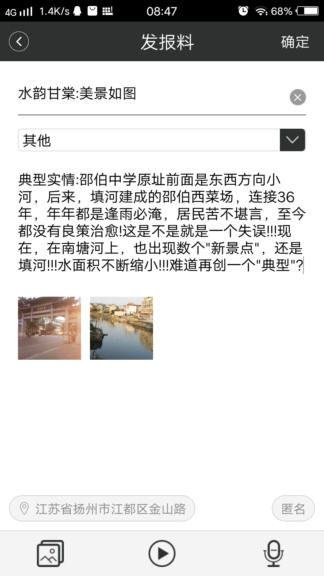 江苏扬州文明古镇邵伯,正在兴建4A风景区,以南塘河为中心点,此河曾经是水上运输主要河线,也是抗洪排涝的水利主要面积,当年为了农田灌水,曾经人工开挖加宽加深,今天的场景有点不可理解:附近新居民开始填河私占扩大土地面积,连续几年,由点到面,了解得知,12345受理投诉后,竟然没有部门实施制止?非法变合法?是国土局,还是水利局,还是联合管理?