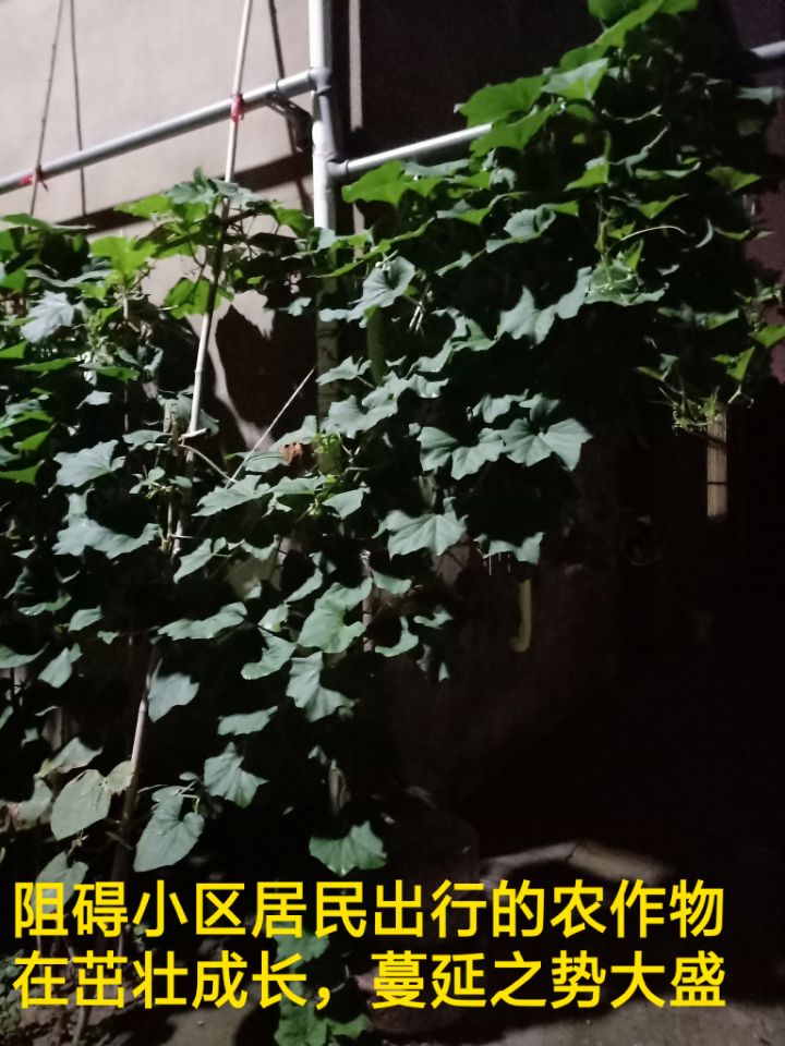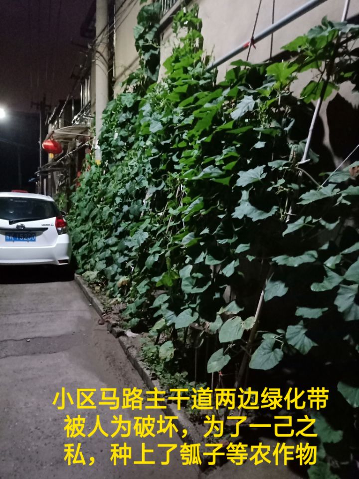 我是文汇东路老秋雨新村小区的居民,看到小区绿化带两旁被人为拔掉的花花草草甚是痛心,特别是某刘姓居民——不仅将瓠子这样的农作物栽种到小区内主干道马路两边的绿化带,农作物的藤茎竟然缠绕在公共天然气管道上,而且该农作物一直向北蔓延,像“天网”一样,在头顶上方覆盖,现已经影响到途径此处,作为唯一公共通道出行的住最里面的住户,并且农作物茁壮成长之势愈演愈烈,一直蔓延生长,势必给居民出行带来不便,特别是晚上,可以预见从此经过的骑车人被农作物刮倒的几率有多大,加之浇灌这些农作物的粪水在这样炎热的夏季味道熏人,完全违背了老小区改造的初衷!
