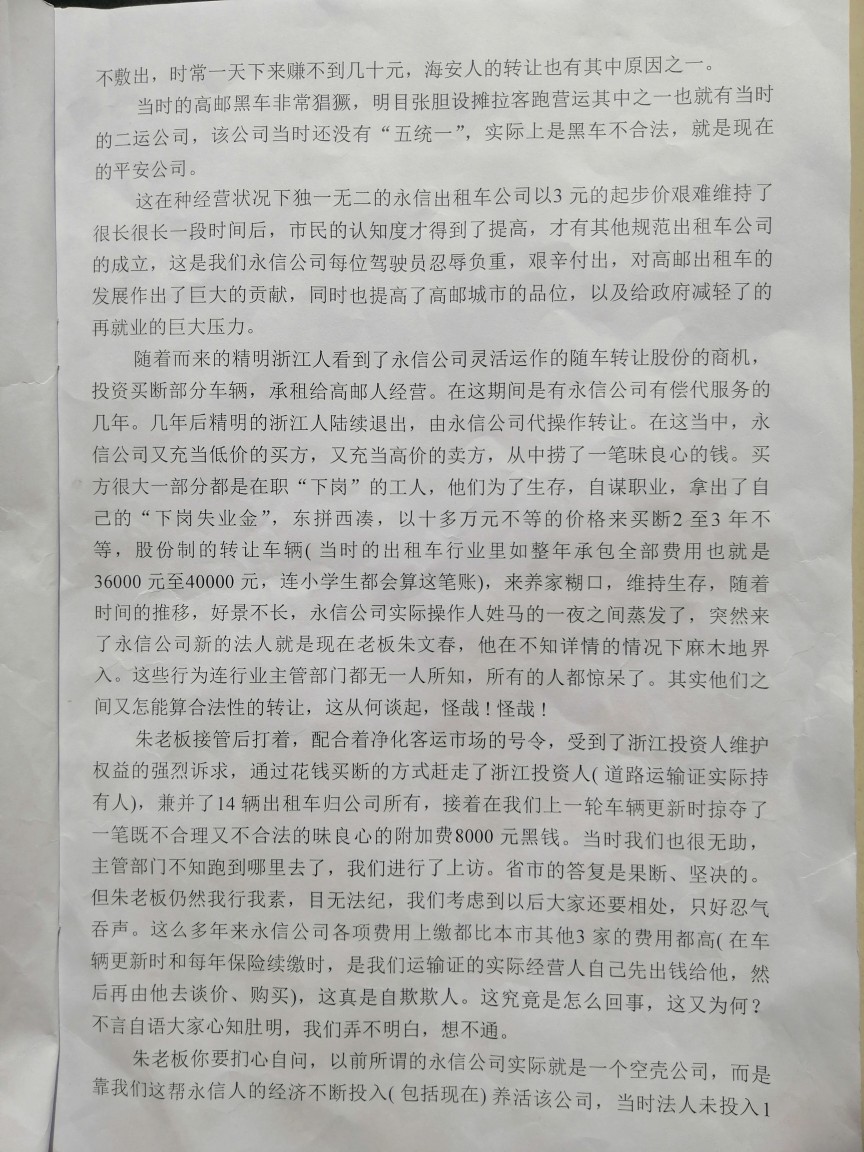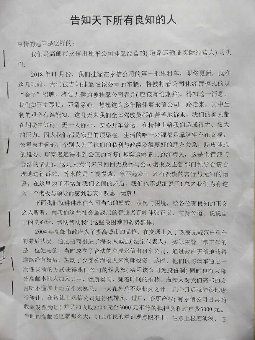 高邮永信出租车黑心老板扬言要无偿收回我们自已购买和运行的车辆,我们一直挂靠经营,交公司管理费用。