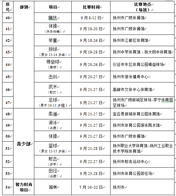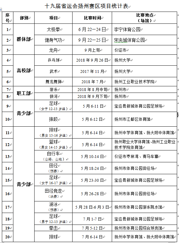 本届省运会将于2018年9月21日在扬州开幕,9月2日日闭幕,共设比赛项目93个大项,赛事总人数约3.5万人(含运动员、裁判员、工作人员等),其中青少部37项(含智力时尚7项)60项次、高校部28项、职工部13项、群体项目15项。在扬州举办的比赛项目54项次,赛事人员近2万人,其中青少部46项次、职工部2项、高校部3项、群体项目3项。
