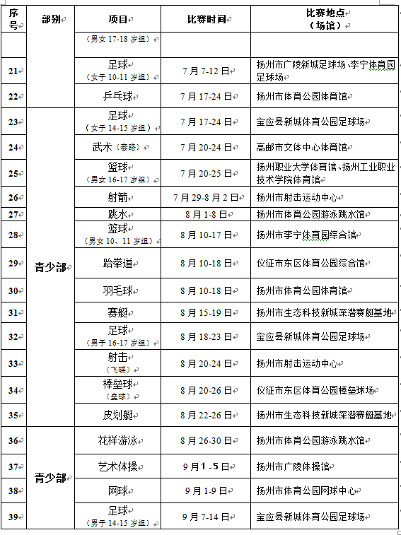 5月中下旬,还将在仪征、宝应、市区举行自行车、足球、田径、田径竞走和游泳比赛。目前,各项竞赛准备工作基本就绪,各赛区比赛场馆进行了现场推演,竞赛器材全部到位并测试完毕,各接待宾馆、车辆全部准备到位,裁判员、志愿者、工作人员等已到岗就位。