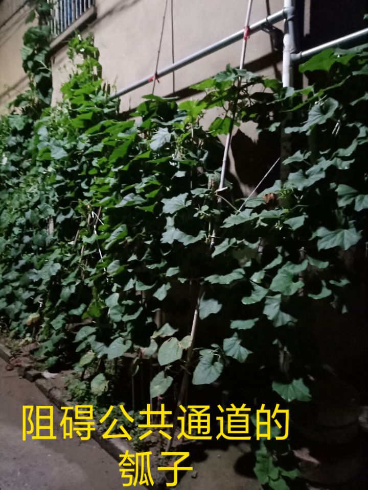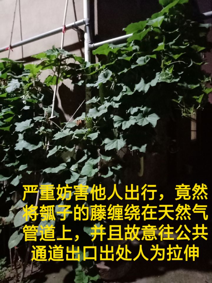 我是文汇东路老秋雨新村小区的居民,看到小区绿化带两旁被人为拔掉的花花草草甚是痛心,特别是某刘姓居民——不仅将瓠子这样的农作物栽种到小区内主干道马路两边的绿化带,农作物的藤茎竟然缠绕在公共天然气管道上,而且该农作物一直向北蔓延,像“天网”一样,在头顶上方覆盖,现已经影响到途径此处,作为唯一公共通道出行的住最里面的住户,并且农作物茁壮成长之势愈演愈烈,一直蔓延生长,势必给居民出行带来不便,特别是晚上,可以预见从此经过的骑车人被农作物刮倒的几率有多大,加之浇灌这些农作物的粪水在这样炎热的夏季味道熏人,完全违背了老小区改造的初衷!