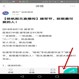 在建军节到来之际,“扬帆”手机频道开设了“建军节,致敬最可爱的人!”图文直播间,欢迎大家进行互动。
