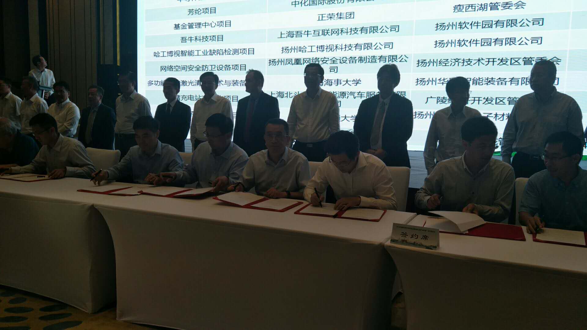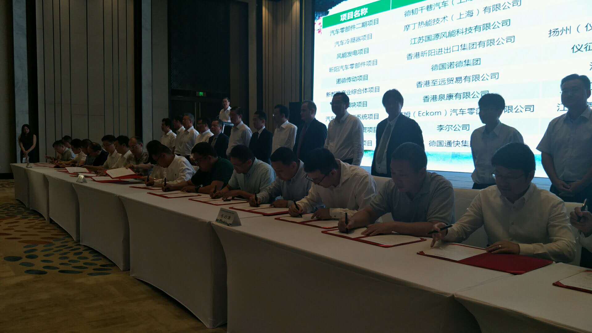 扬州市领导和在第一排就座的各位嘉宾移步签约台见证项目签约。第一批10个项目上台签约,分别是:总投资6600万美元的汽车零部件二期项目、总投资5000万美元的汽车冷凝器项目、总投资4400万美元的风能发电项目、总投资2000万美元的昕阳汽车零部件项目、总投资3000万美元的诺德传动项目、总投资2.3亿美元的新都路商业综合体项目、总投资1.5亿美元的汽车模块项目、总投资2571万美元的汽车产业智能系统项目、总投资6000万美元的李尔汽车电子增资项目、总投资3000万美元的德国通快增资项目。