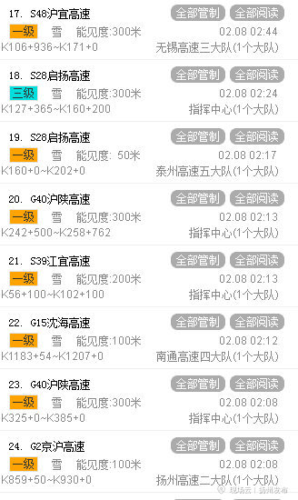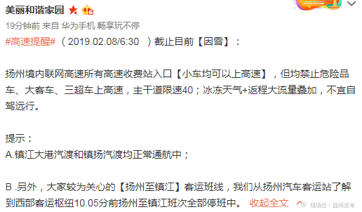 扬州境内联网高速所有高速收费站入口【小车均可以上高速】,但均禁止危险品车、大客车、三超车上高速,主干道限速40;冰冻天气+返程大流量叠加,不宜自驾远行。