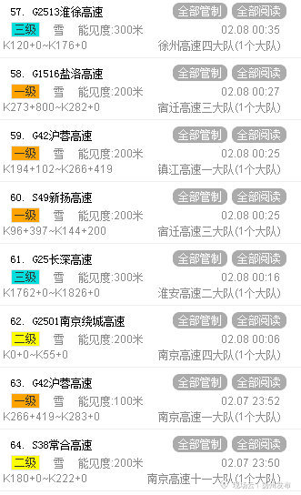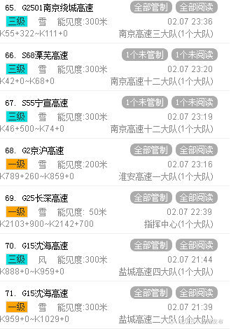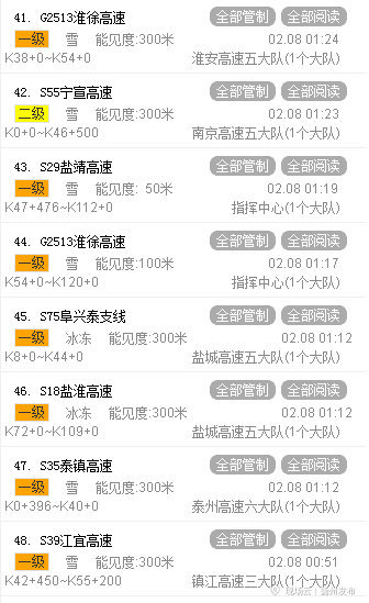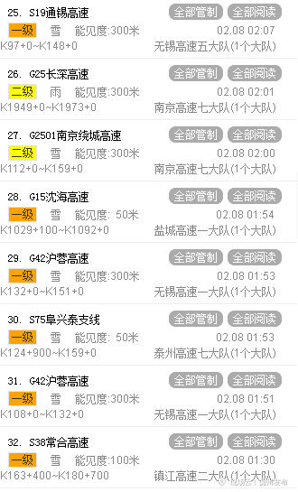 最后 G3京台高速,G1516盐洛高速,G36宁洛高速,S48沪宜高速,S18盐淮高速,S19通锡高速无锡段、通洋段,S29盐靖高速,S39江宜高速,S55宁宣高速,S65徐明高速,S68溧芜高速,S75阜兴泰支线,S79南通支线,S83无锡支线,S85溧阳支线,S86镇江支线,S87南京支线,S92金湖支线以及S96宿迁支线等都是全线关闭。