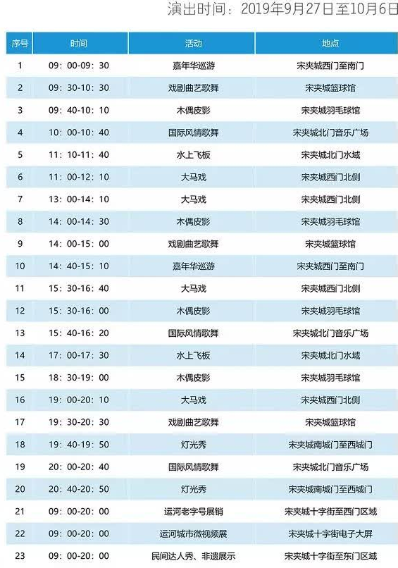 活动期间,灯光秀、开幕式、民间达人秀、非遗展示展演、运河老字号展销、运河城市微视频展、嘉年华巡游、木偶皮影表演、运河城市摄影展、国际风情歌舞、运河戏曲曲艺歌舞表演、“千年运河·宜居扬州”展示、水上飞板、大马戏、运河美食小吃等15项活动,将在宋夹城的东南西北四个门,中心区域十字街以及园内羽毛球馆、网球馆、篮球馆等场馆展开。