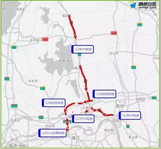 2.由北往南方向:G2京沪高速扬州、广靖段,G15沈海高速盐城、南通段,G25长深高速淮安、无锡段,G1515盐靖高速泰州段,S49新扬高速淮安段;