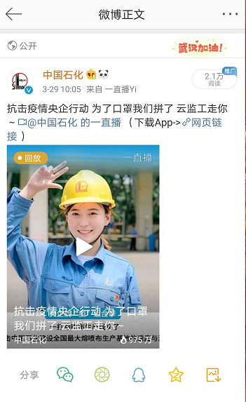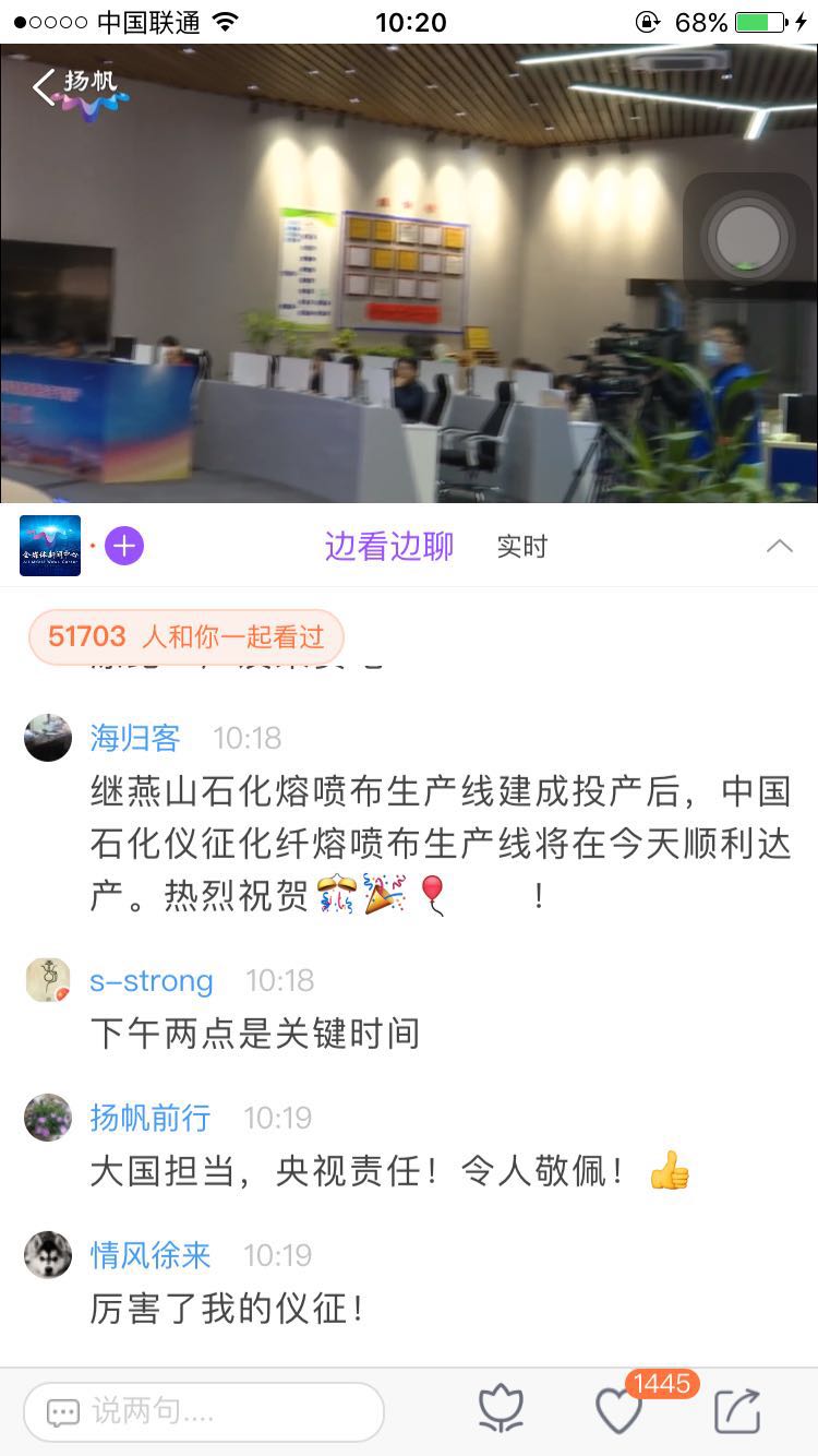 中国石化一直播同步在线转播“中国石化仪征化纤首条熔喷布生产线正式投产”,目前,其点击量已经达到975万!