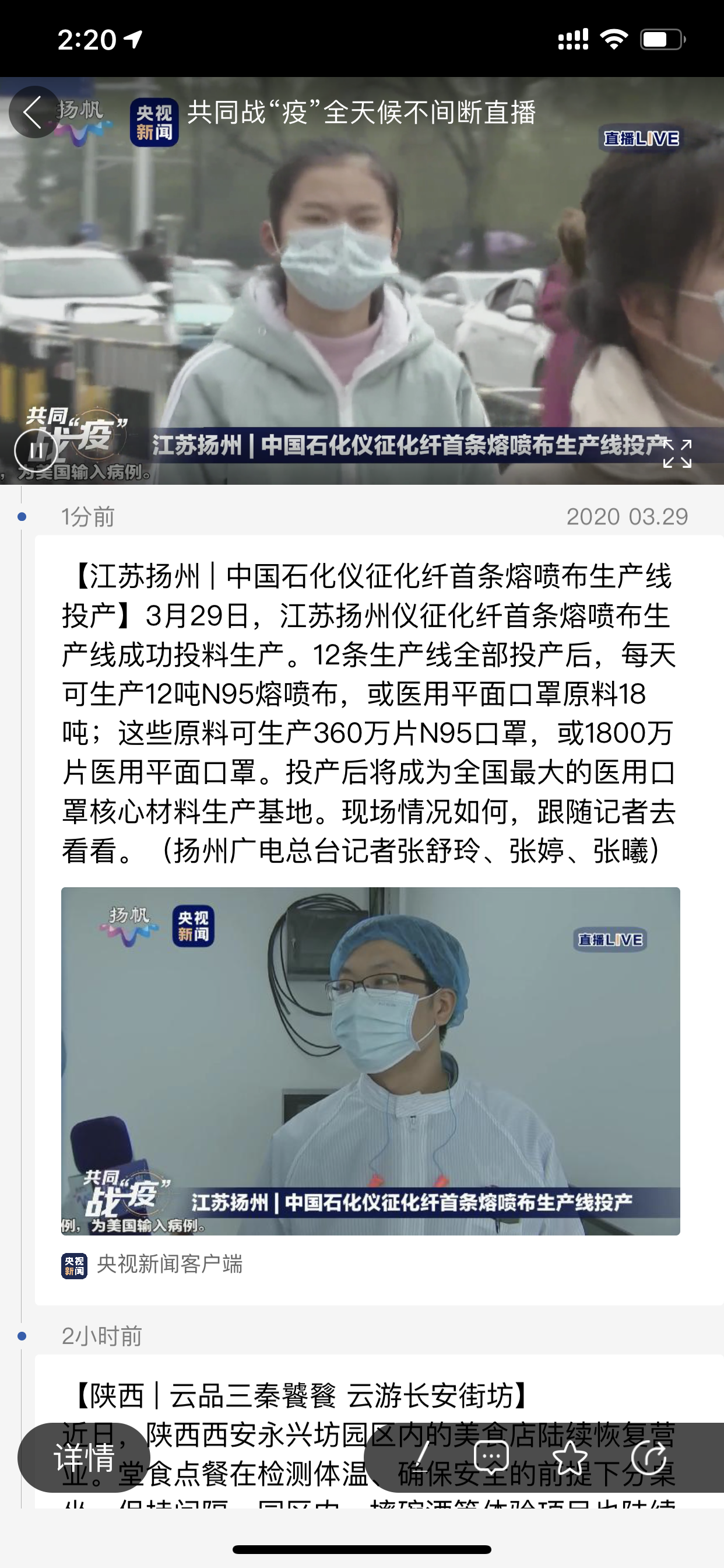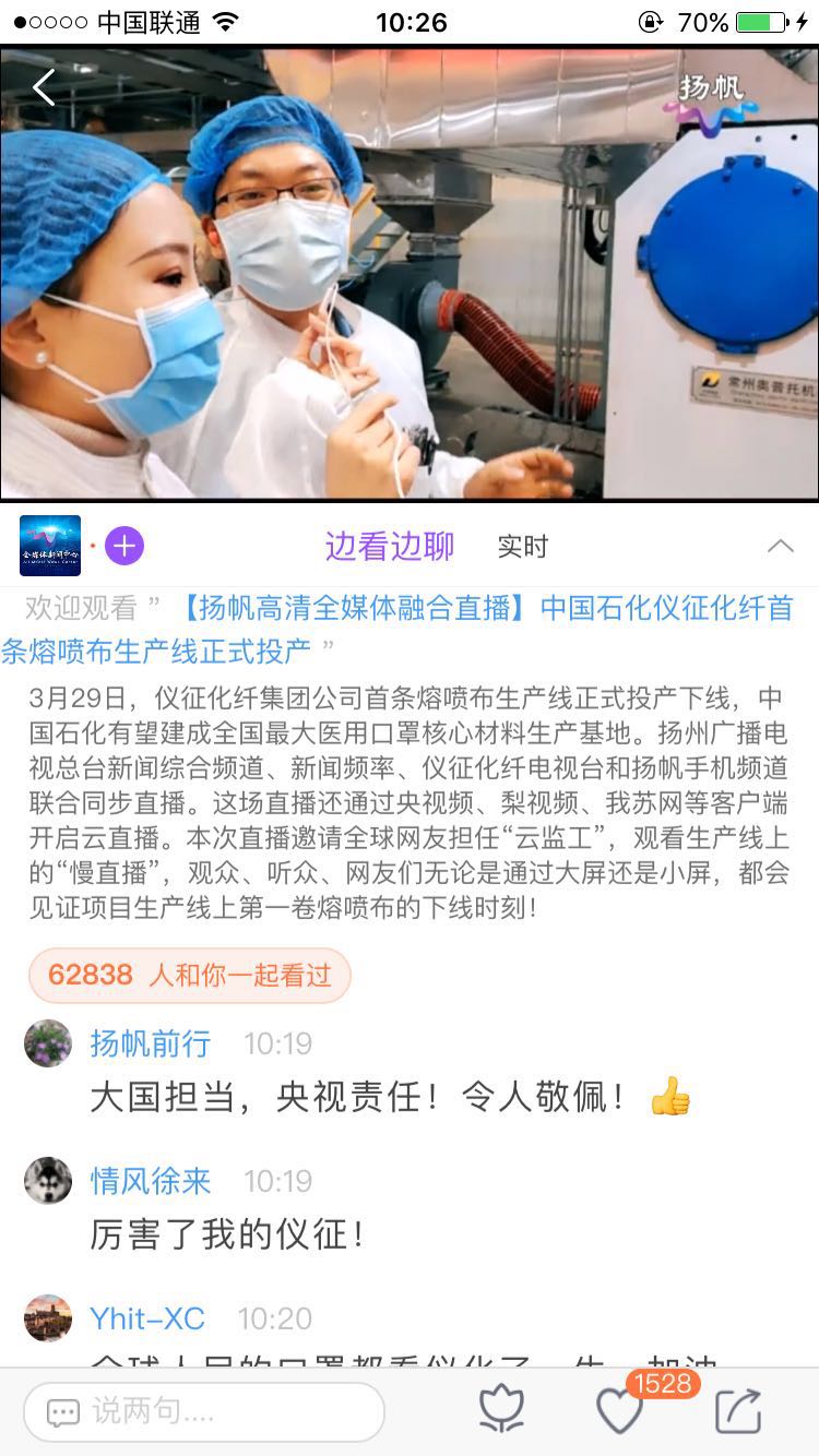 3月29日,仪征化纤集团公司首条熔喷布生产线正式投产下线,中国石化有望建成全国最大医用口罩核心材料生产基地。扬州广播电视总台新闻综合频道、新闻频率、仪征化纤电视台以及扬帆手机频道将联合同步直播。