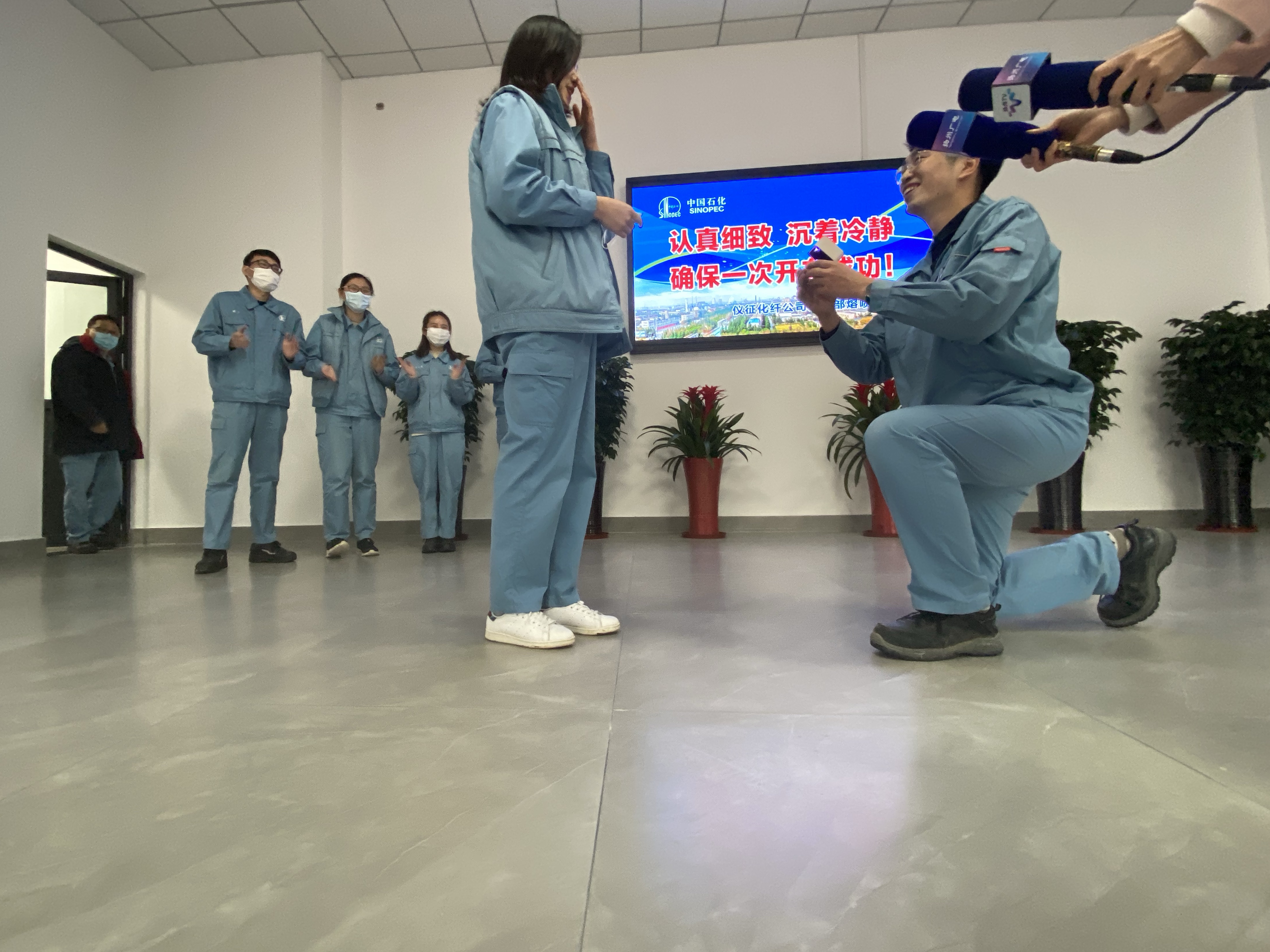 刚刚,就在熔喷布产线开车成功的第一时间,牛越说,不能再等了!于是就在生产车间外,牛越向女友单膝跪地求婚,献上钻戒。现场的工作人员为这对幸福的小情侣送上真挚的祝福!