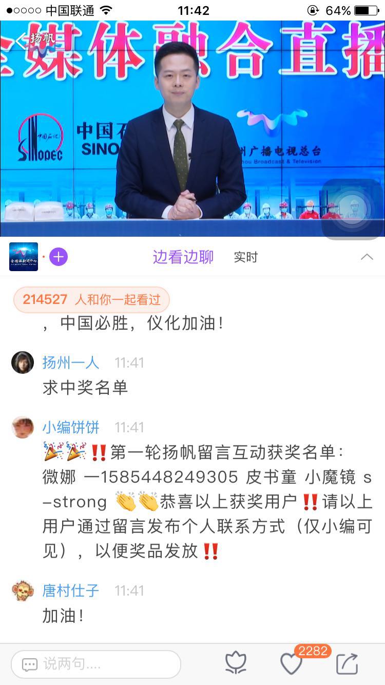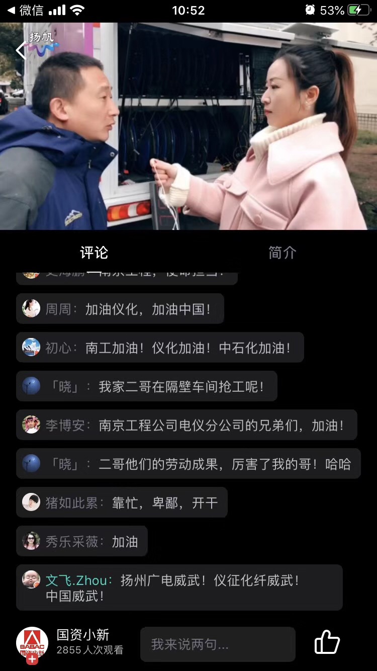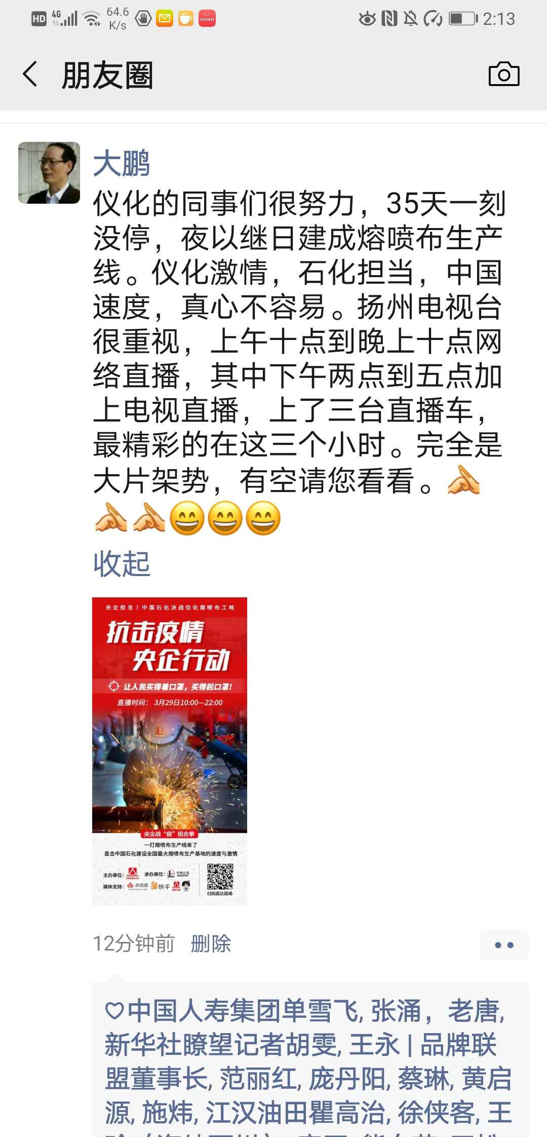“仪化激情,石化担当,中国速度”、“三台直播车,完全是大片架势!”中石化新闻发言人吕大鹏在个人微信朋友圈点赞仪化和扬州广电总台!