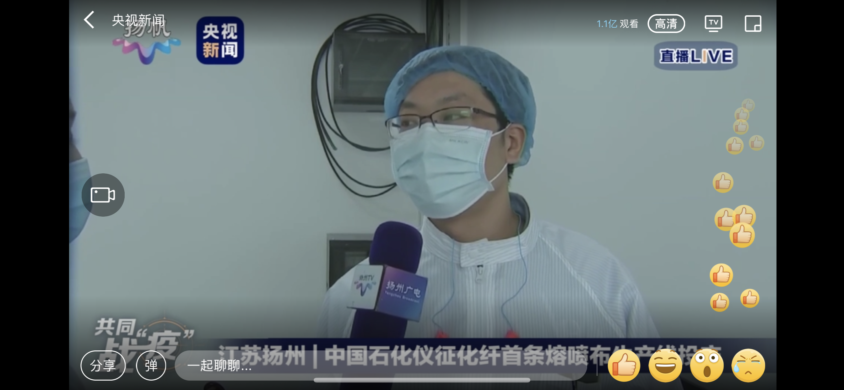 今天晚上7点,中央电视台新闻频道《新闻联播》节目以《中石化医用口罩核心材料生产基地投产》为题,报道了中石化仪征化纤首条熔喷布生产线建成投产,见证了央企的“速度与激情”。