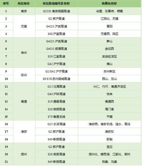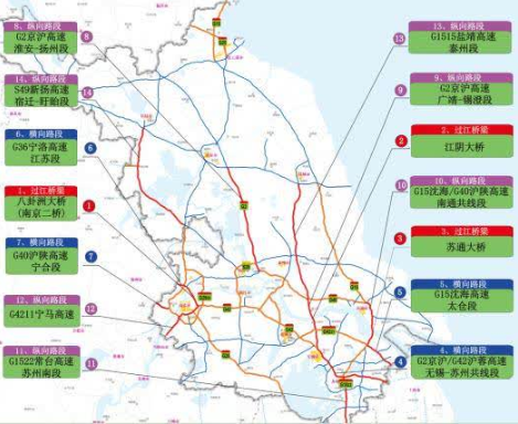 1.由北往南方向:南京二桥、泰州大桥、江阴大桥、苏通大桥,G2京沪高速扬州、广靖锡澄段,G15沈海高速南通段,G25长深高速淮安、常州段,G1515盐靖高速泰州段,G2513淮徐高速宿迁段,G4011扬溧高速镇江段,S28启扬高速扬州西北绕城段,S49新扬高速宿迁、淮安、扬州段;