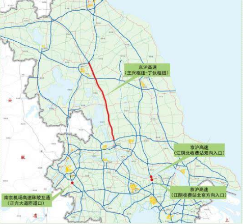 由北往南方向:南京二桥,江阴大桥,苏通大桥,G2京沪高速淮安段,G15沈海高速步凤至白驹段,G1515盐靖高速兴化至桥头段,S28启扬高速扬州北至汊河段,S49新扬高速泗洪至管镇段。