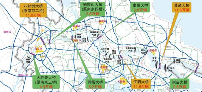 八卦洲大桥(南京二桥)、江阴大桥、苏通大桥、崇启大桥