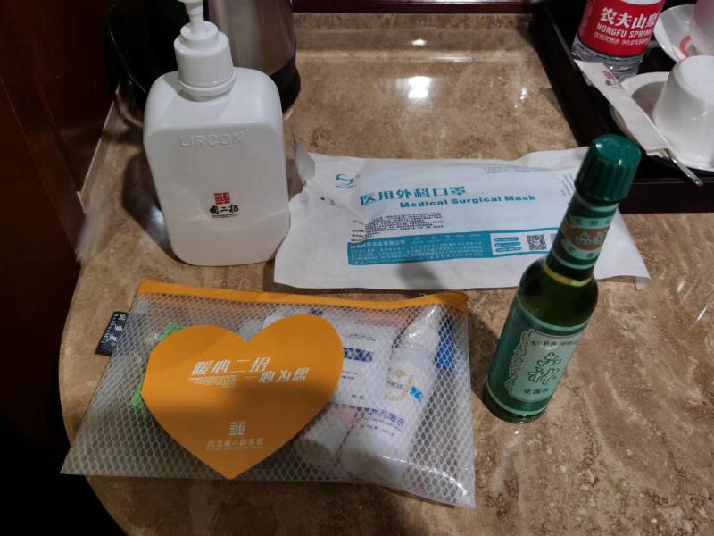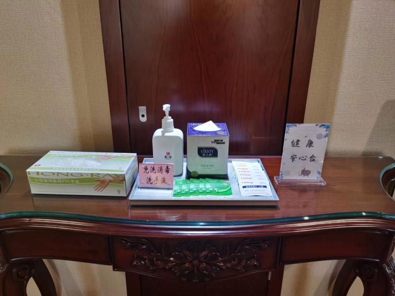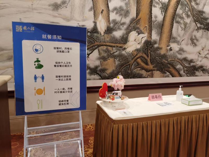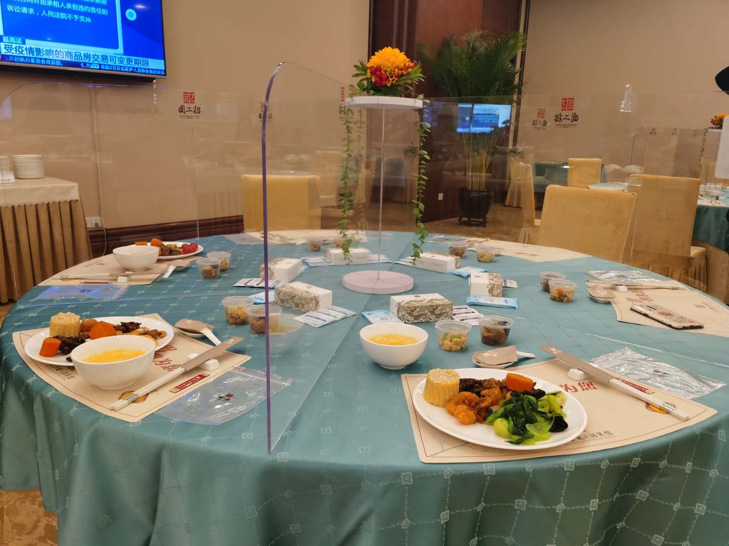六人一桌,餐桌上有透明隔断!这是代表们到达驻地后的第一餐,以后都是这样就餐!会场内外到处可见洗手液、消毒液等防疫物资。