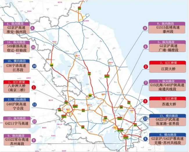 元旦期间,全省高速公路流量较大,预计有14个路段在高峰时段可能会出现车多缓行现象,主要为3座过江桥梁、4个横向路段和7个纵向路段。