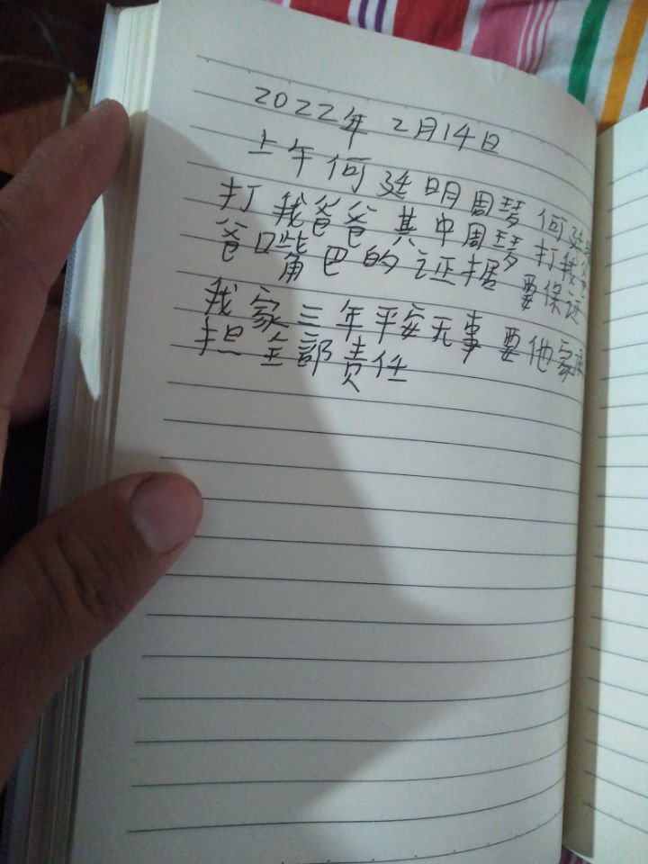 `江苏扬州邗江区槐泗镇团结村何庄组李周琴打我爸爸嘴巴无法无天了天理不容她是何廷明的妻子,必须要求何廷明保证我家三年平安无事他家,承担全部责任,这是重要证据