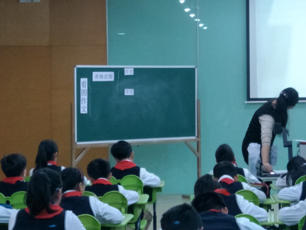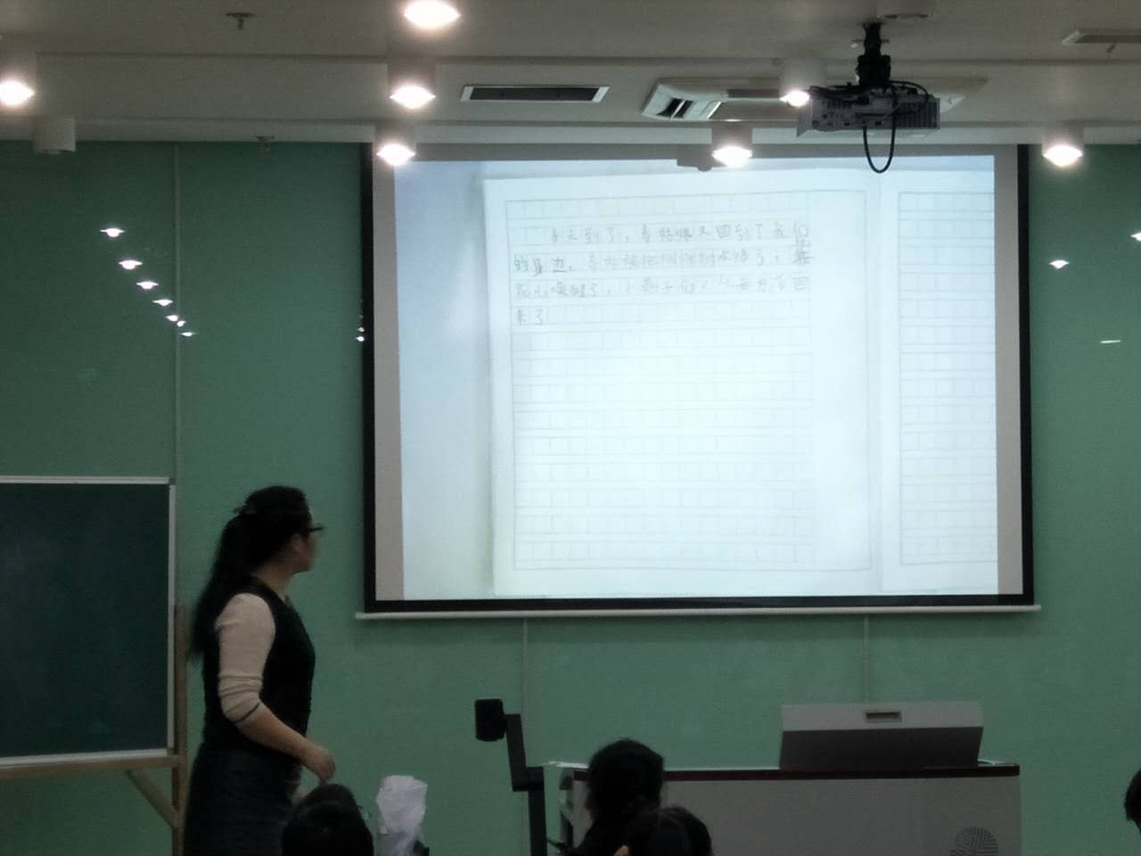 老师将学生写的作文展示在投影仪上