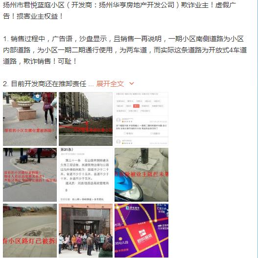 扬州市开发东路君悦蓝庭小区(开发商:扬州华亨房地产开发公司)欺诈业主!虚假广告!损害业主权益!