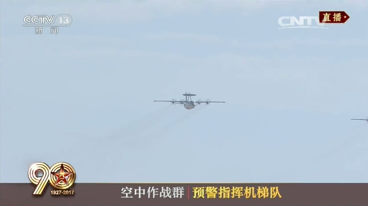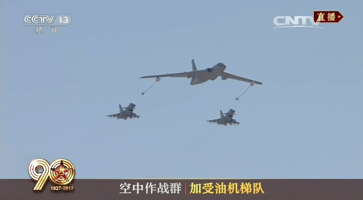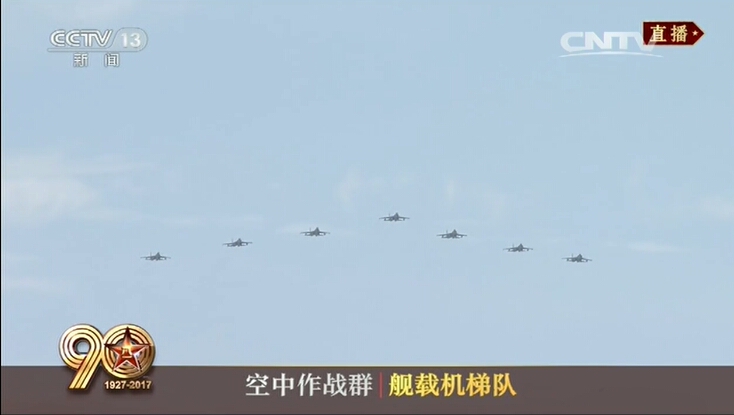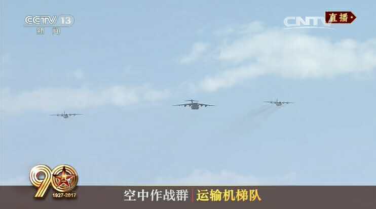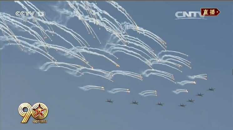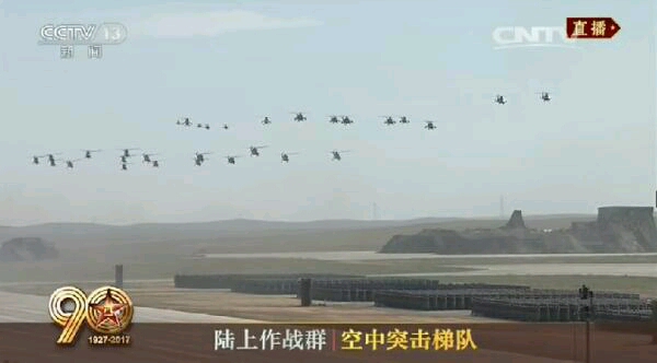 纪念标识梯队精彩亮相,17架直升机组成“八一”标识。24架直升机绘出“90”字样,象征着人民军队走过了90年光辉历程。