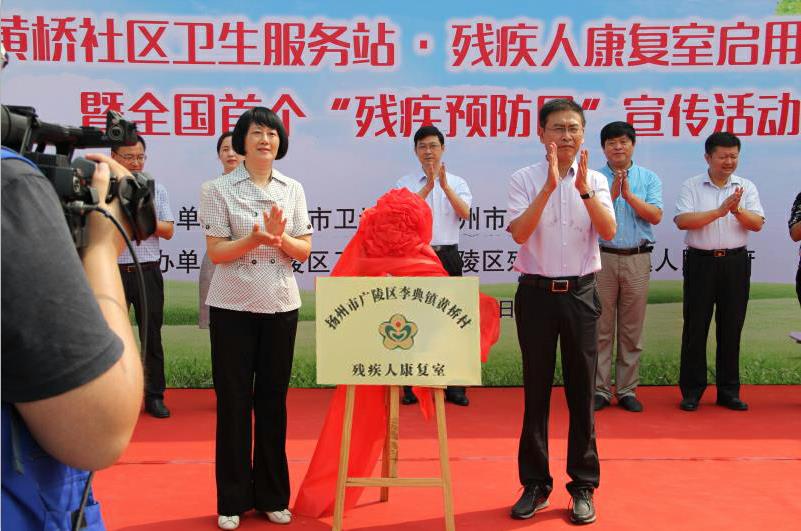 扬州市残联理事长顾爱华女士和广陵区委副书记刁顺勤先生共同为“黄桥村残疾人康复室”揭牌。