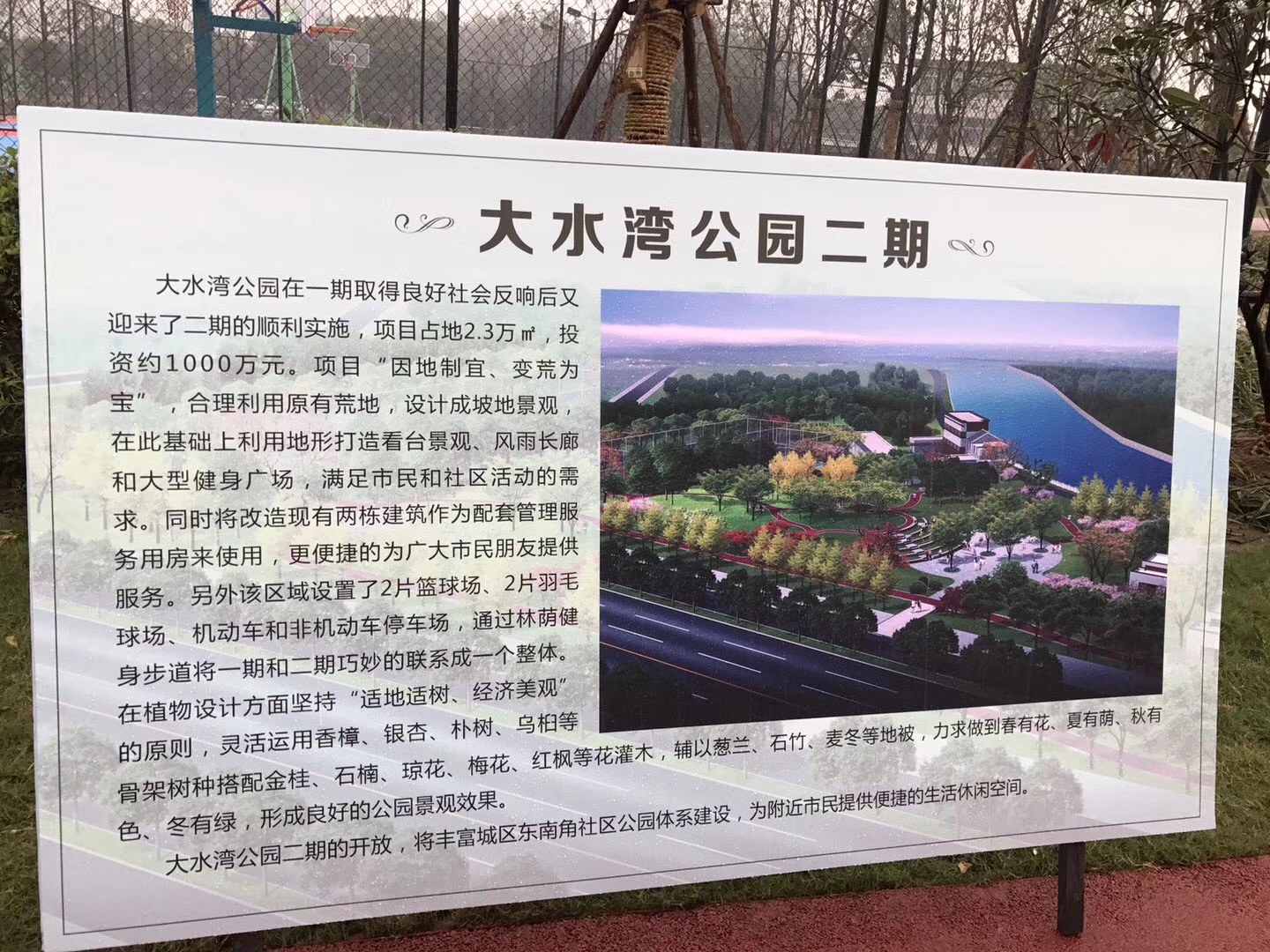大水湾公园二期位于城市东南片区,是在一期成功打造的基础上,广陵区的又一重点民生项目,占地面积2.3万平方米。公园合理利用原有地形,设计坡地景观,打造看台景观、风雨长廊和大型健身广场,设置2处篮球场、2处羽毛球场,以及机动车和非机动车停车场,并通过林荫健身步道,将一期和二期巧妙联系成一个整体。为周边居民提供了良好的亲近自然、休闲休憩、体育健身、文化娱乐的活动场所。