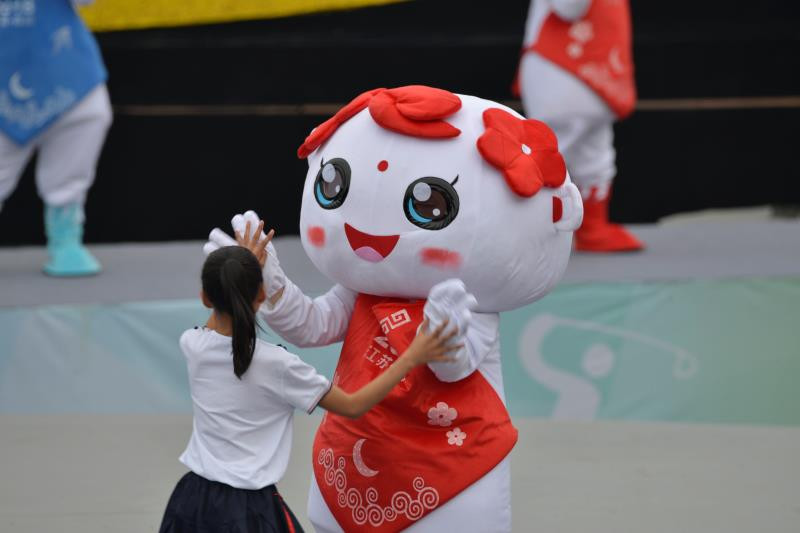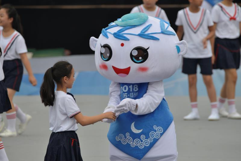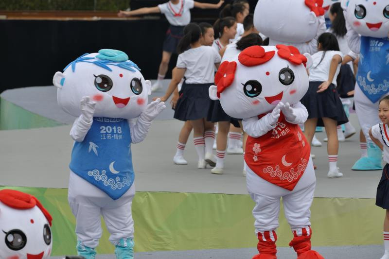 江苏省总工会副主席马永青先生为我们揭晓省运会吉祥物。江苏省第十九届运动会吉祥物是——欢欢、乐乐!吉祥物是以扬州市树“杨柳”、市花“琼花”为原型的可爱形象,这是呼唤人与自然的和谐。