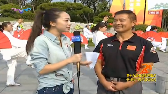 与宋夹城现场主持人刁梦雪连线。现场采访健美操李团长。