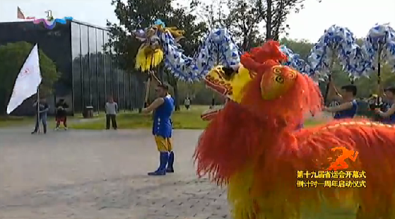 与宋夹城现场主持人戴文杰连线。现场表演舞龙的都是在校大学生,曾取得上一届省运会的冠军。