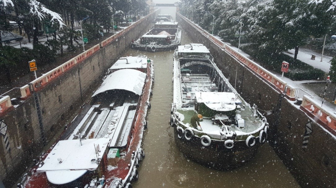 1.4日凌晨为保障船舶的安全放行,邵伯船闸工作人员坚守在运行第一线。大面积的降雪导致航空、铁路和道路运输均受到不同的影响,水路运输的优势凸显。